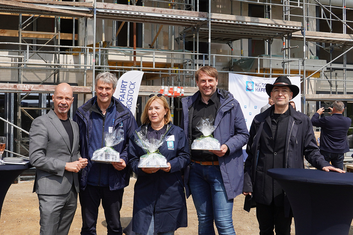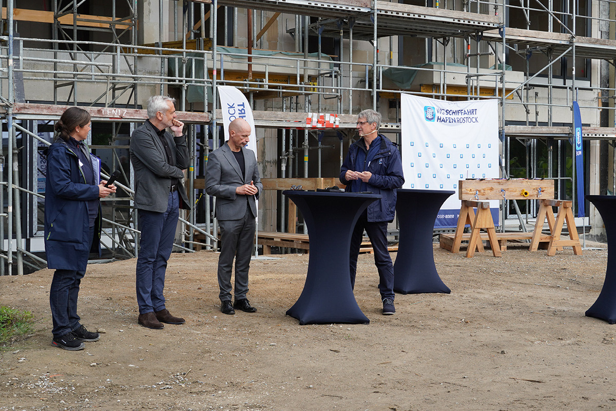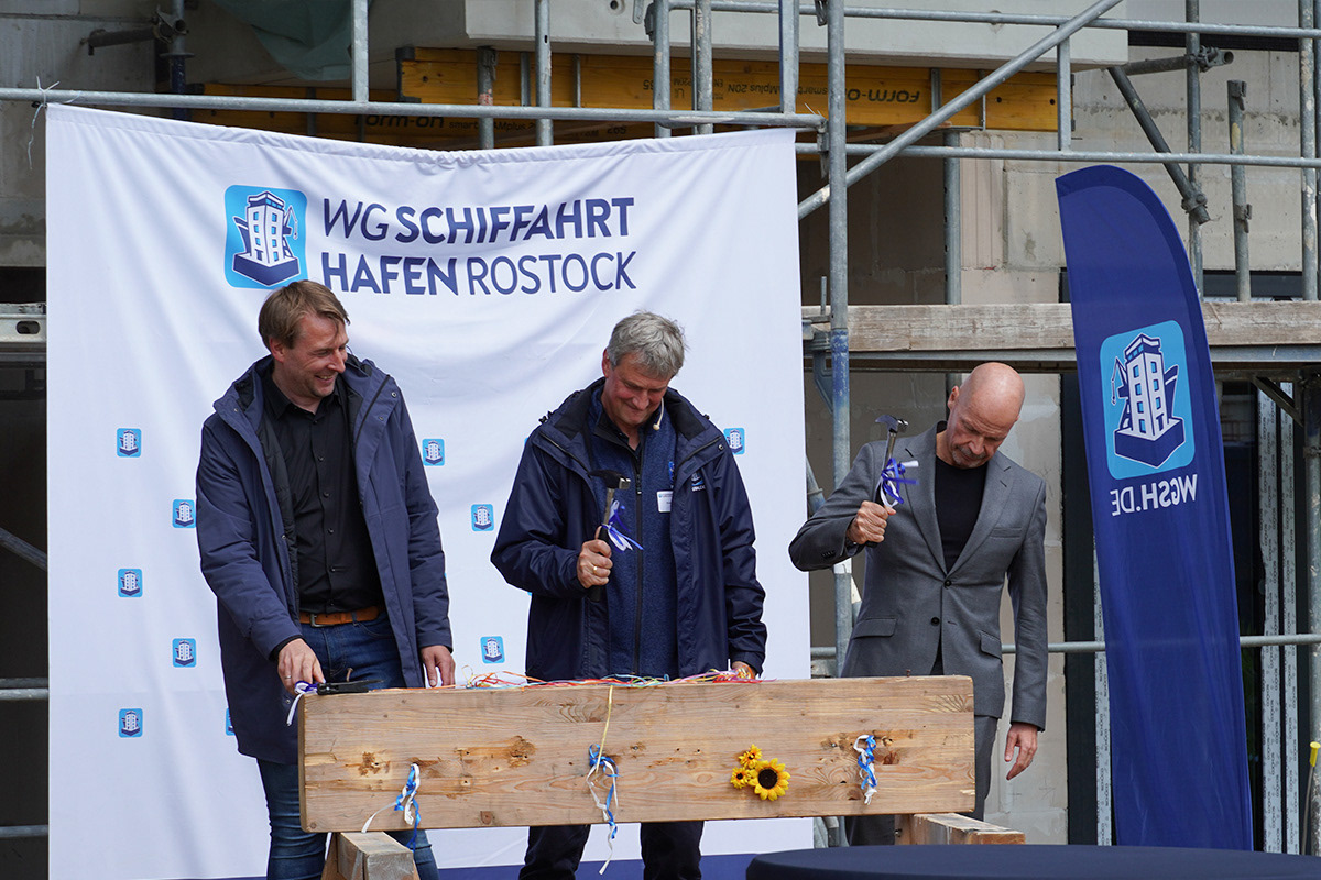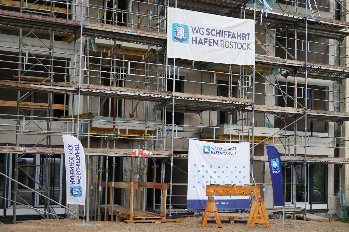 Heute war es endlich so weit: Der Höhepunkt unserer bisherigen Bauarbeiten, das Richtfest der Neuen Bleicherstraße 21/22 in Rostock, fand in einer festlichen Atmosphäre bei strahlendem Sonnenschein statt. Gegen 11 Uhr begrüßte WG Schiffahrt-Hafen Rostock alle Firmen, Handwerker und Planungsteams. Es wurden interessante Gespräche geführt und feierliche Ansprachen gehalten. Im Anschluss folgten der traditionelle Richtspruch sowie das Einschlagen von 3 Nägeln, welche mit Applaus begleitet wurden.