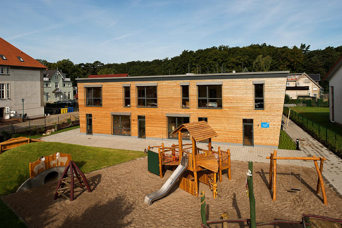 Der Neubau der integrativen Kindertagesstätte “Arche Noah” im Ostseebad Kühlungsborn wurde in moderner und zeitgerechter Architektursprache geplant. Die Ausführung der Kita als kompletter Holzrahmenbau nimmt das Thema “Verwendung von Holz als nachwachsender Rohstoff und Träger regenerativer Energie unter Bindung von CO2” auf. Der Auftraggeber wünschte die Nutzung erneuerbarer Energien bei diesem Bauvorhaben und unterstützte diese Ansätze, obgleich enorme wirtschaftliche Zwänge bezüglich der Gesamtkosten für das Vorhaben bestanden. Das Schiffsmotiv spiegelt sich in der äußeren Baukörperausbildung mit geneigten Wänden und einer haptischen Holzbeplankung wider und ist auch im zentralen 2-geschossigen „Schiffs-Innenraum“ prägend.