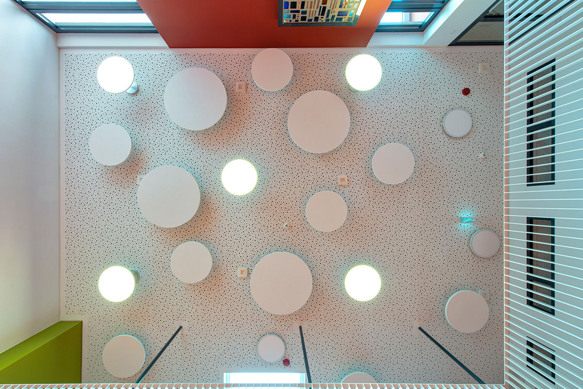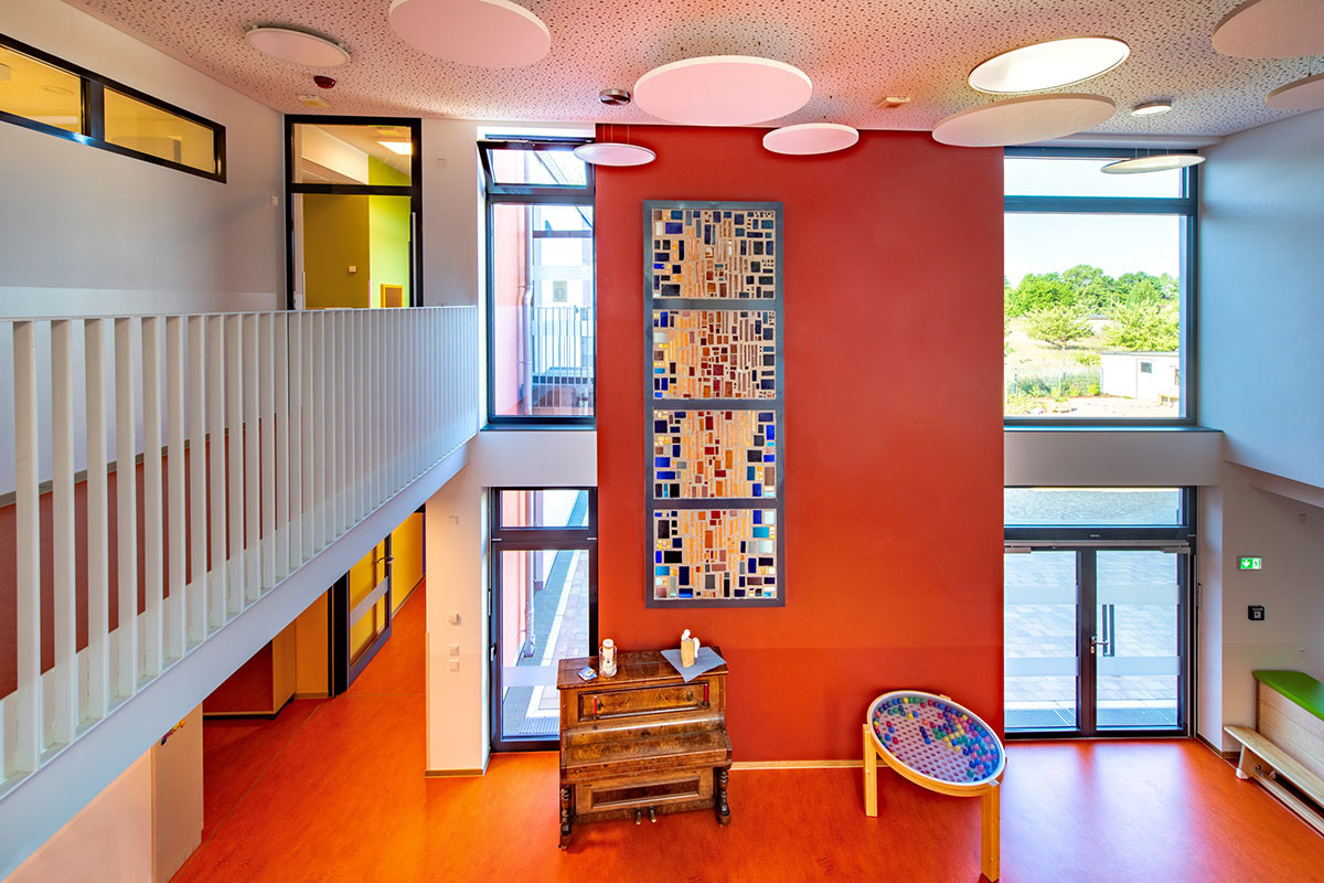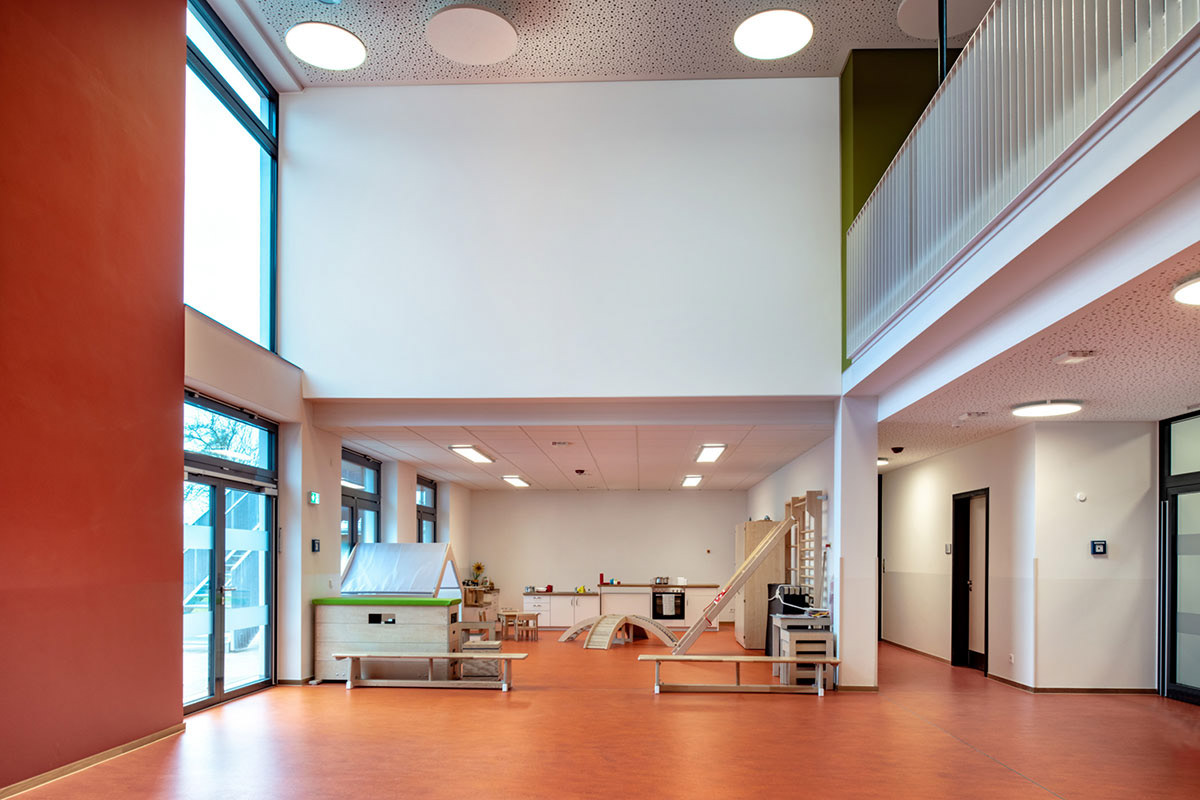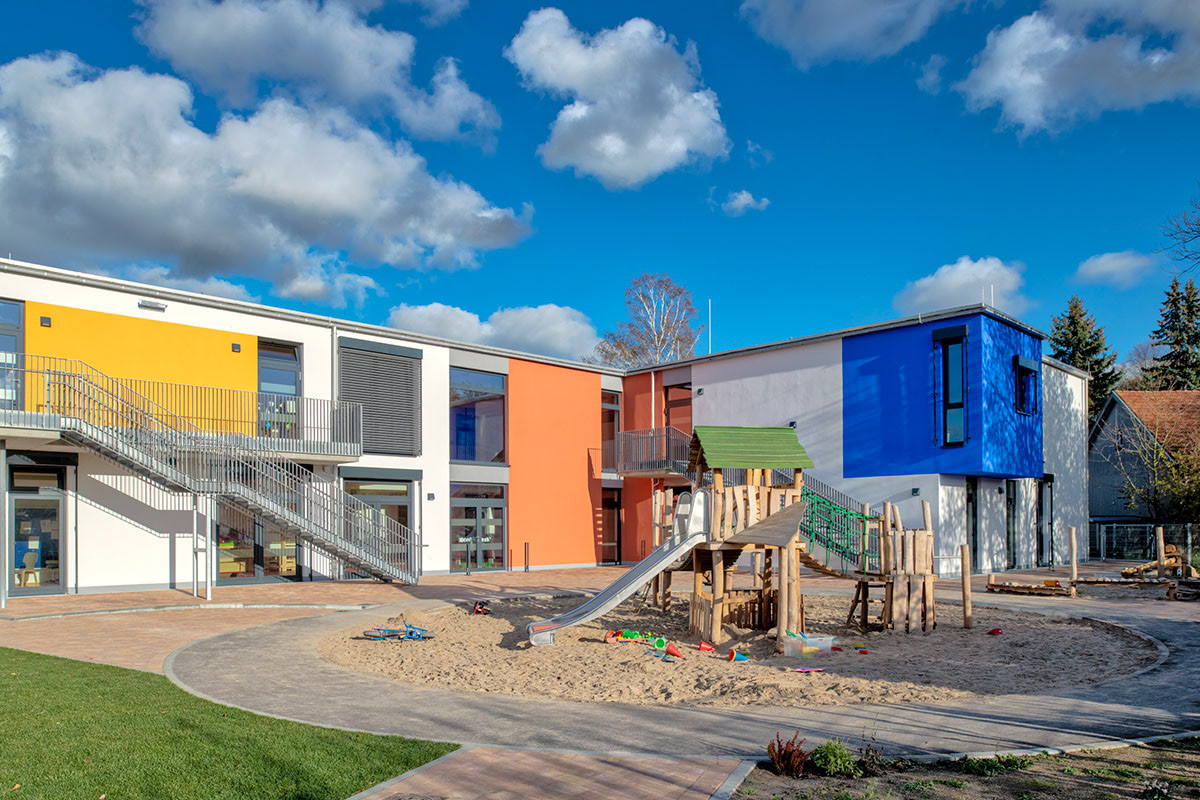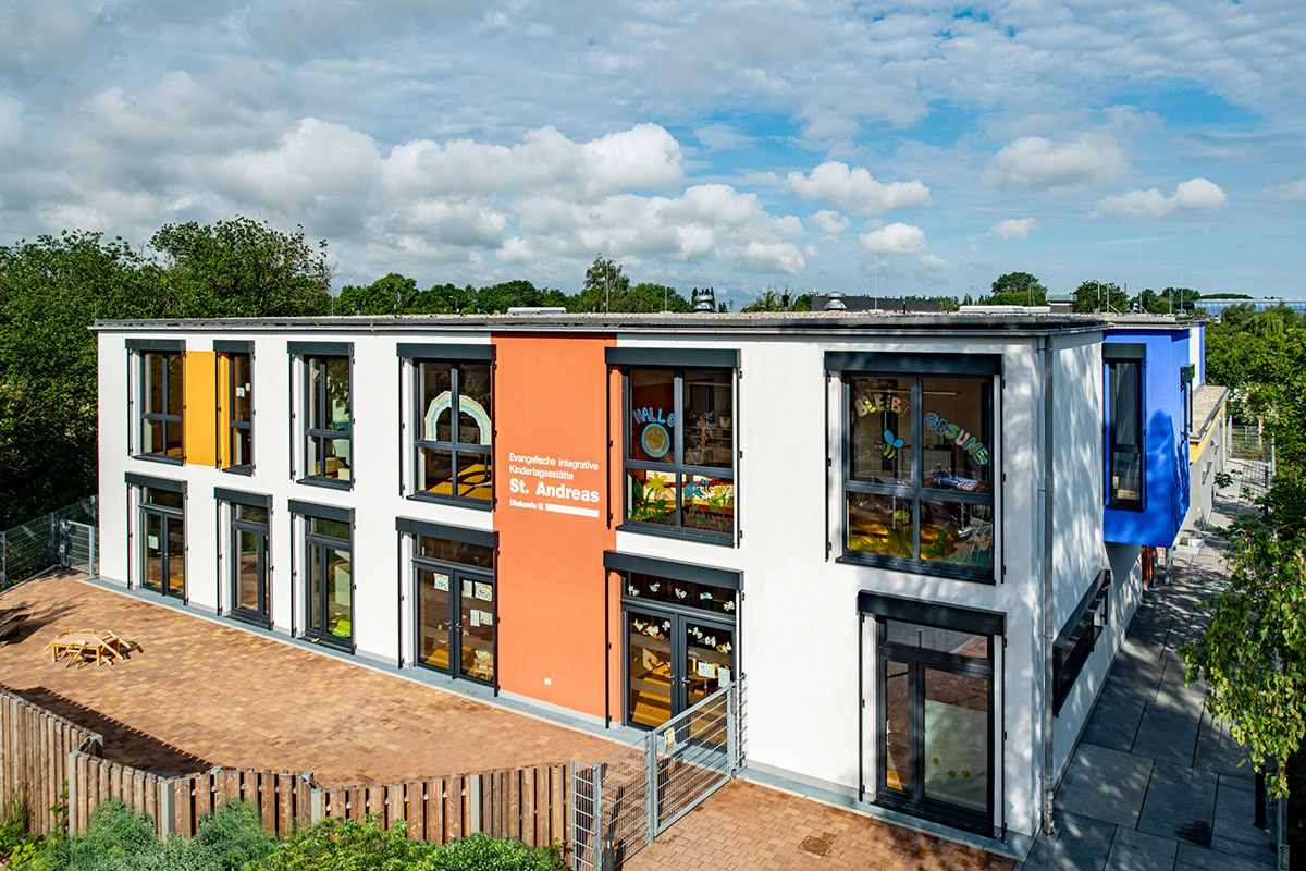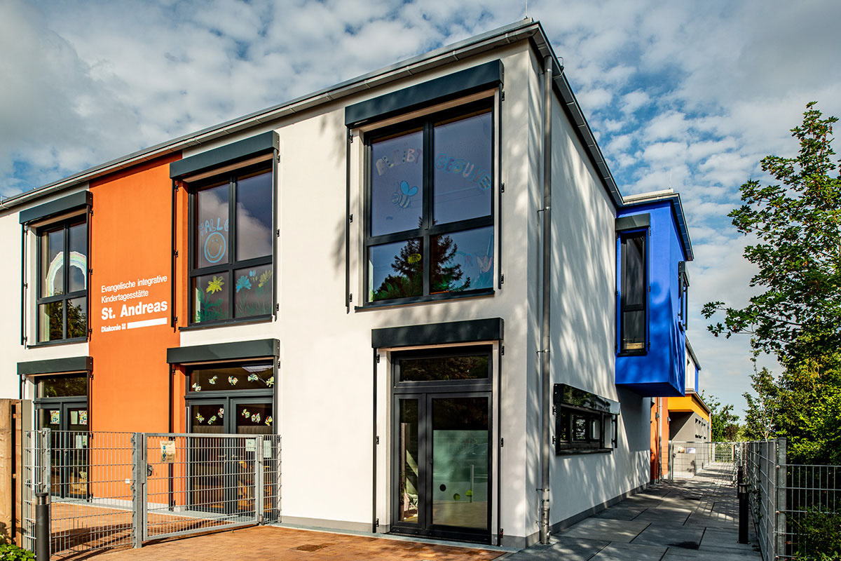 Der L-winkelförmige, 2-geschossige Kindertagesstätten-Neubau in Rostock-Reutershagen ersetzt das ehemalige Luther-St.-Andreas-Gemeindezentrum und ermöglicht die Betreuung von 111 Kindern. Durch die Form und die Einordnung des Gebäudes wird die optimale Belichtung der Gruppenräume nach Ost und Süd sowie die Verbindung des Innen- und Außenraumes mit der Schaffung geschützter Bereiche für die Kinder erreicht.